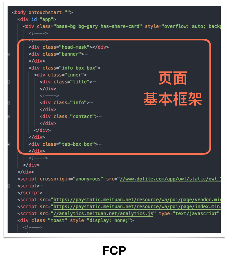 - FCP:包含页面的基本框架,但没有数据内容。