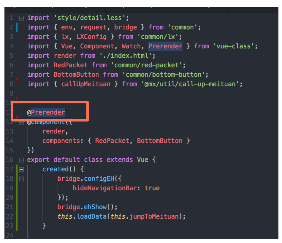 项目中主要是使用 TypeScript,利用 TS 的装饰器,我们封装了统一的预渲染构建的钩子方法,从而只用一行代码即可完成构建时预渲染的触发。