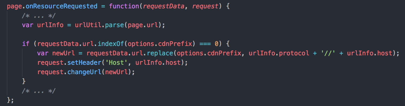因为在做预渲染时,我们使用启动了一个模拟的浏览器环境,根据 phantom 提供的 API,可以对发出的请求加以劫持,将获取 CDN 文件的请求劫持到本地,从而在根本上解决了这个问题。示例代码如下: