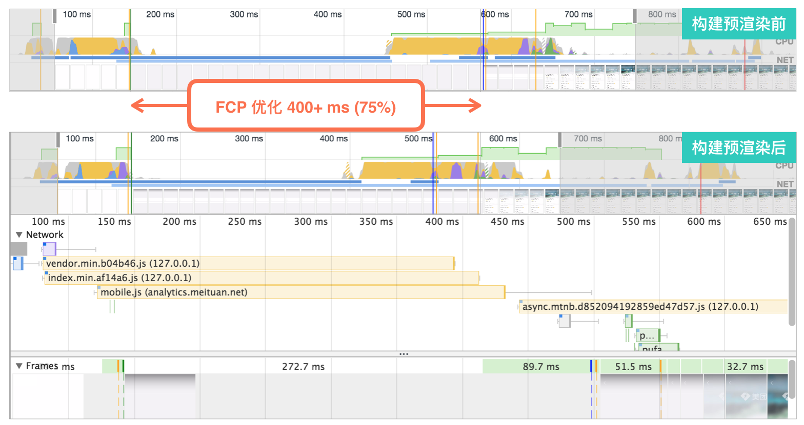 通过构建时预渲染在项目中的使用,FCP 的时间相比之前减少了 75%。