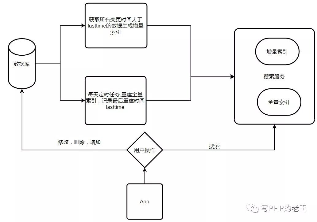 先来看如何把sphinx集成到业务当中。sphinx可以设置多个索引。虽然sphinx生成索引很快,但是对于大量数据,每次数据变更多重新建索引,还是会有很大的额外开销。目前主要的解决方案是通过更新增量索引实现sphinx数据实时更新。索引sphinx中其实有两个索引数据,一个全量索引,一个增量索引。如果数据是后面新增的,会在增量索引中找到。如果数据修改,或删除,则配合sql_query_killlist可以屏蔽旧的索引数据,从而保证对修改的数据以增量索引为主。以下是sphinx使用的一个说明图: