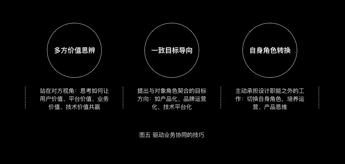 多方价值思辨: 为了更好地撬动业务资源,你需要主动去游说各方。除了提供一份独创性、有价值的设计方案之外,还需要深入思考对方需要什么。你需要对各个职能的工作内容有一个明晰的了解,需要站在对方视角将各方价值论证清楚,思考用户、平台、业务、技术价值分别是什么,你能给对方带来什么,“思其所想、破其所难”的方式更容易打动对方。