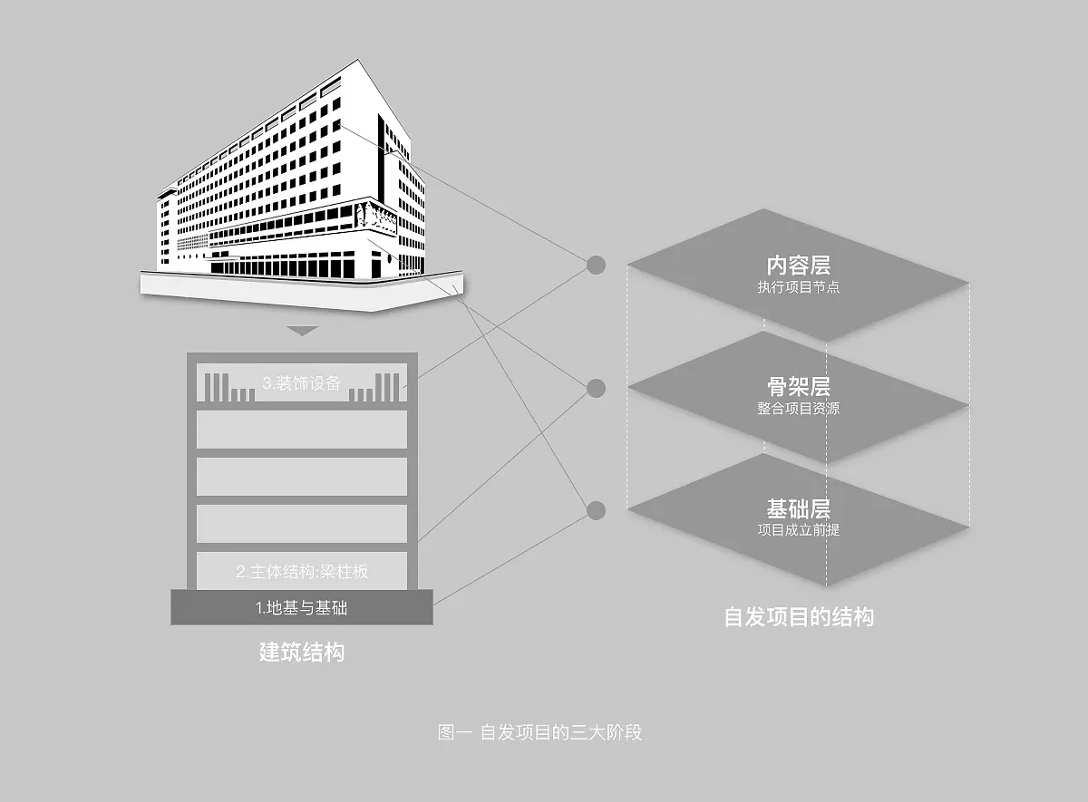 几个自发项目的实战让我明白了一个道理,用设计驱动力去落地一个项目就像建造一幢建筑。一幢建筑的使用离不开地基、骨架结构、设备与装饰,地基可以保证建筑基础的稳固,梁、柱、板等主体性结构可以支撑起整个空间框架,水、电、暖甚至一些功能性家居可以增强空间的使用性。同样,一个自发项目也需要不同的结构来支撑,你需要思考并拆解一下项目的不同阶段,要重点完成项目的预先评估、前期成立、后期执行与落地等环节,以保证项目的基础、骨架及节点内容的阶段性落地。
