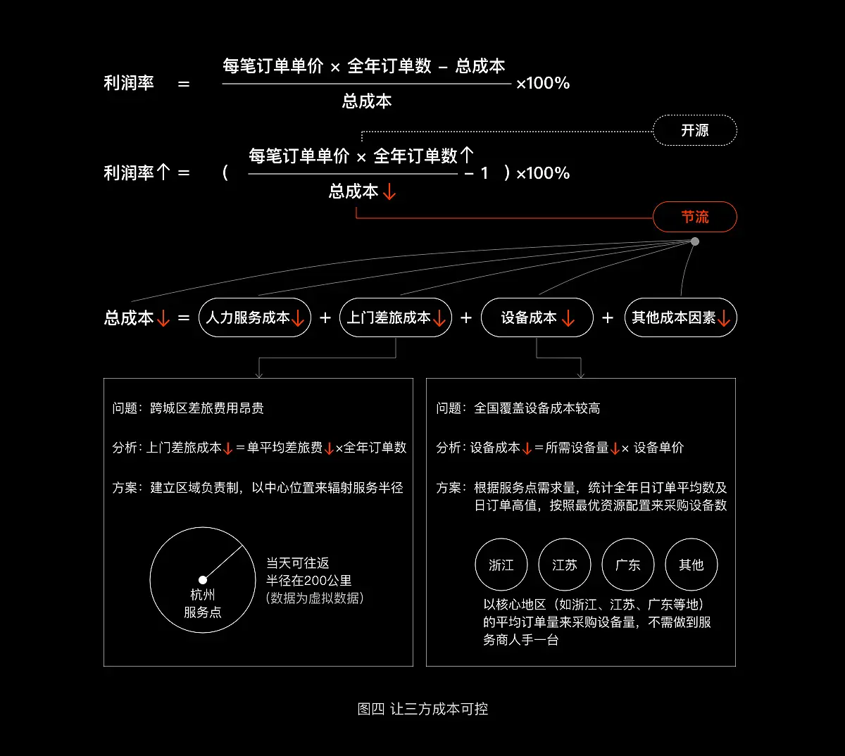 而三方服务成本则是运营成本及人力成本交叉混合的一种形式,也是最难评估的一种类型。这里举个例子,当全景验厂自发项目起步时,需要同时考虑客户、业务及三方价值,为了让各方利益最大化,需架构出一套商业模式,商家购买全景拍摄服务、服务商上门采集商家的全景图像,平台则通过运营这套服务模式获取利润。在项目初期,为了刺激服务商团队快速增长,提高运营规模,对每个订单补贴了一定的服务经费。而为了提高全景服务的商业变现能力,必须解决一个问题,如何提高该业务模式下的营收利润率。为此,我们需要拆解一下该模式下的利润率模型,发现可以通过提高全年订单数(开源)、减少总成本投入(节流)的方式来提高利润率。因开源涉及因素较多,这里不再详细描述,重点讲一下节流的模式。而节流的关键就是在降低总成本,用全景的方式去采集工厂图像,就需要考虑三方人力拍摄成本;因工厂分布在全国各地,上门拍摄产生的差旅成本也是一笔大支出;而全景拍摄势必离不开设备,设备的投入成本更是难以预估,一台专业设备至少需要近万的价格。
