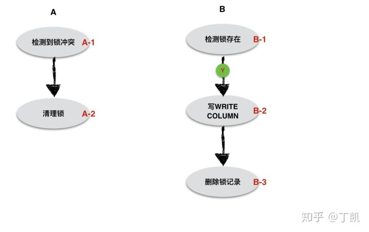 节点作为Primary在事务B的commit阶段写WRITE COLUMN失败:意味事务B提交失败,那么事务A可以直接删除事务B在LOCK COLUMN中的锁记录