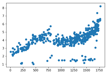 plt.scatter(data.time, data.cjdanjia)