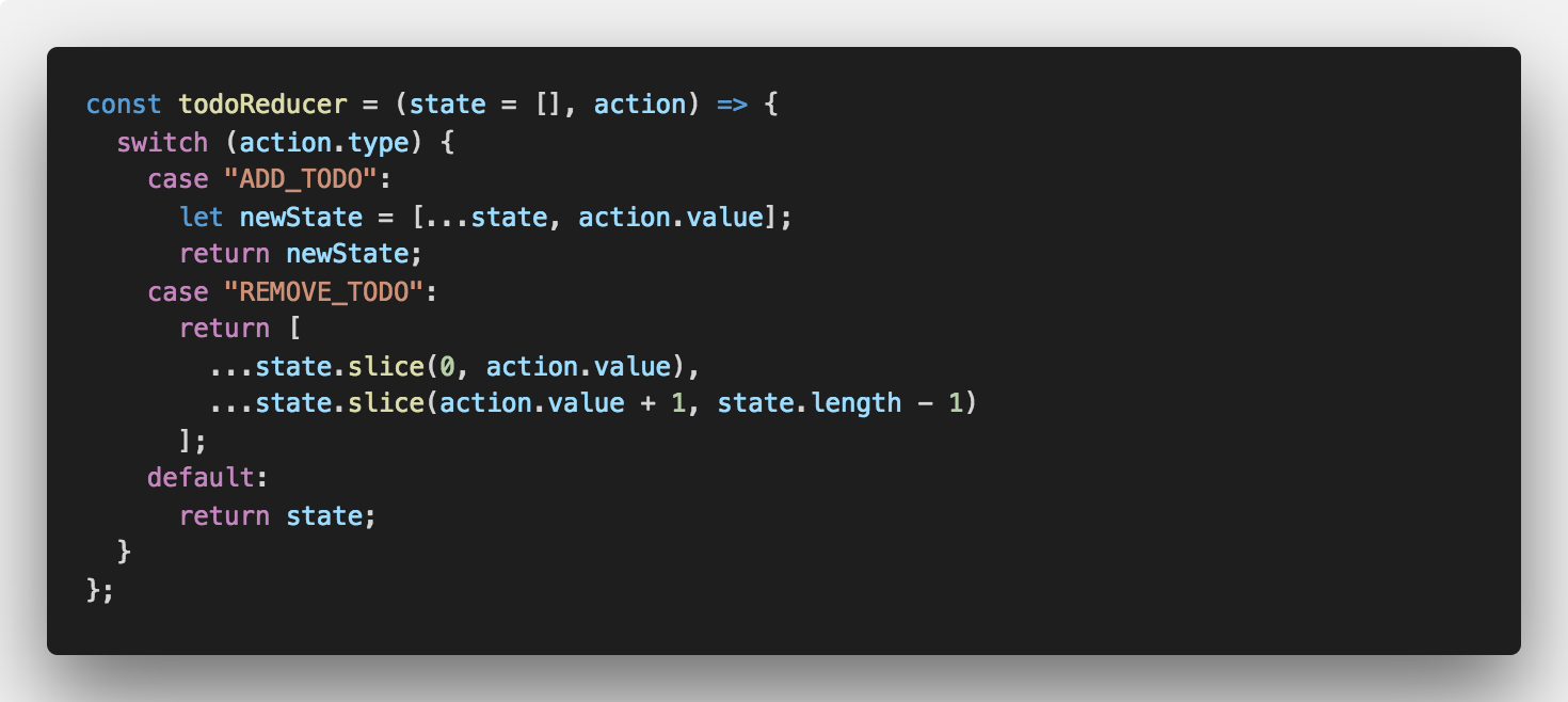 If you return to our reducer function definition hopefully it now makes more sense. By reading the action.type the reducer knows whether it needs to add a todo to the state or remove one from it. It has the todo item passed in the add_todo. It appends to the current state using the spread operator. In the remove_todo it uses the spread operator to create a new array appending the current state sliced twice, once with all the elements before the one to remove and second with all the elements after the one to remove, thus creating our new state object with the todo item removed.