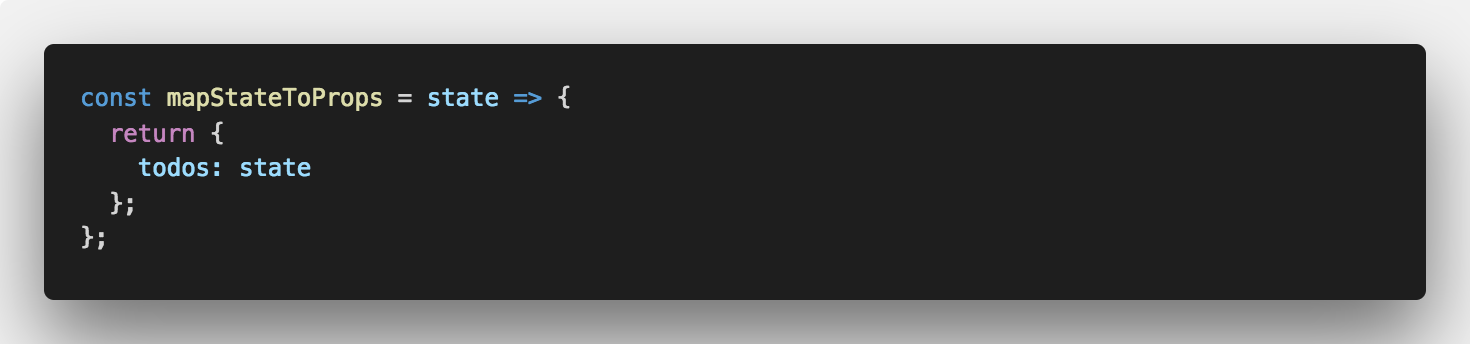 The mapStateToProps takes the entire state as a parameter and you take only what you need from it. Here though as our state only contains the list of todos. We need that list in our ToDo component, we will return the entire state as a property called todos.