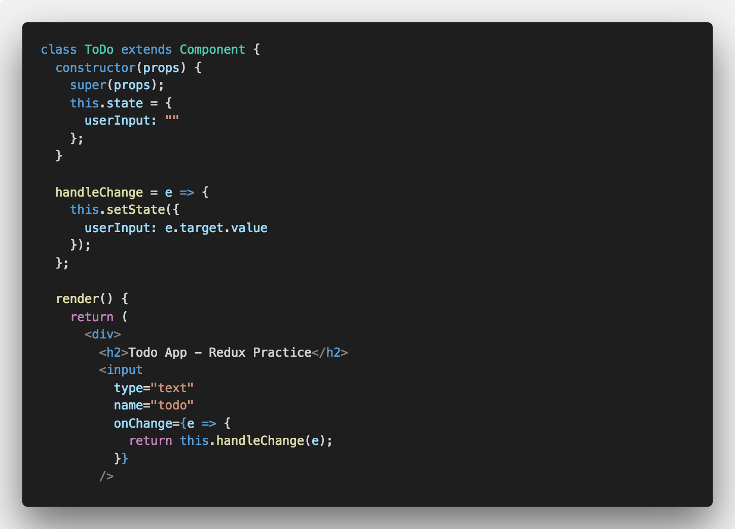 The component is a stateful component containing one state element to keep track of what the user has typed into the input. We have a function called handleChange. This function updates the state every time the user types anything into the input. So far this is all we will write. We need to understand more about Redux before we can write the logic. The logic will add new todos to the state and retrieve current ones from the state to render on the page.