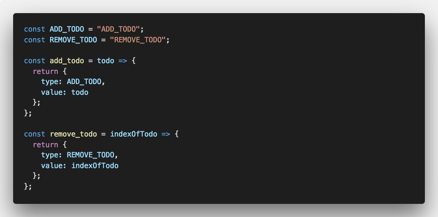 If you remember our reducer responded to 2 action types — “ADD_TODO” and “REMOVE_TODO”. We will define those actions with our action creators. In our add_todo action will return “ADD_TODO” as the type and the todo item we want to add to the store as the value (we need the store to add this todo item to the state so it gets passed in here). In the remove_todo we return “REMOVE_TODO” as the type and the index of the todo item in the store as the value. We’ll need this to remove it from the list of todos.