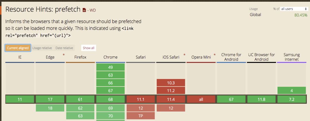 既然一个内容除了获取数据之外都能提前进行,那何不直接提前加载一个文件呢?prefetch 你值得拥有,兼容性如下图: