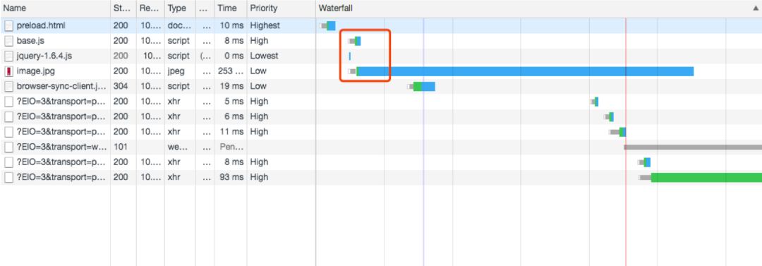 当页面执行 preload 加载文件时,不会阻碍其他文件的加载: