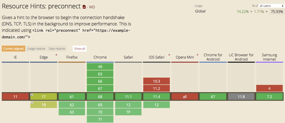 针对 HTTPS :可以提前为 URL 建立早期链接,可提前完成包括 DNS 解析 + TCP 三次握手 + TLS / SSL 握手环节; 再来看看其兼容性如何: