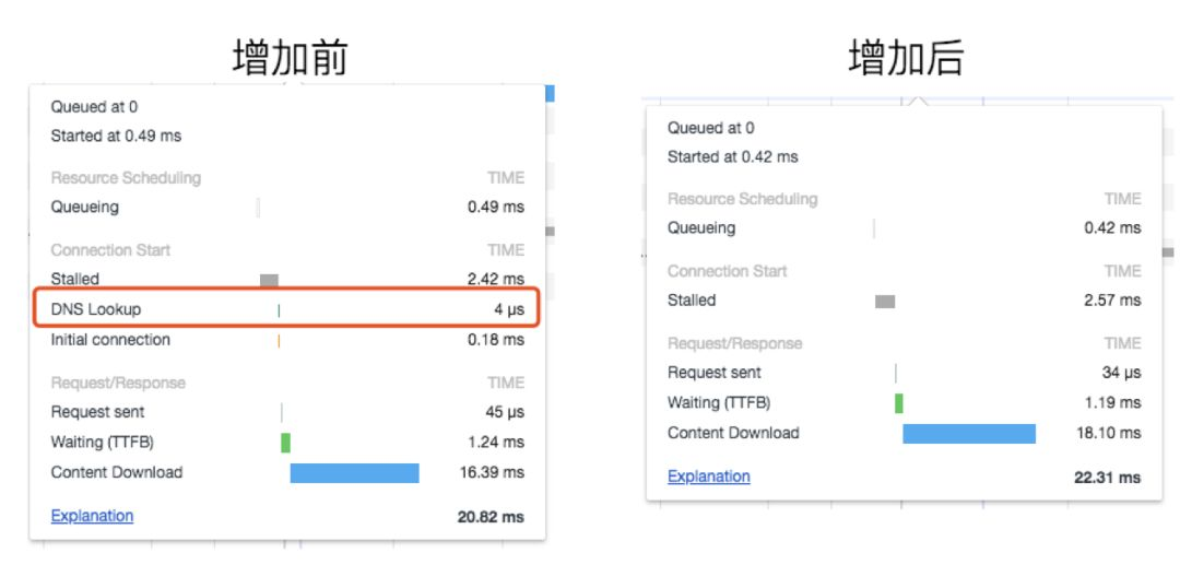 最直观的效果,在页面加载中少了 DNS Lookup 的时间,也就是解析 DNS 的时间。
