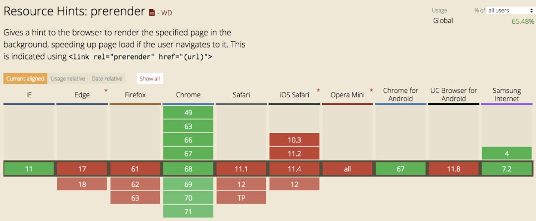 prerender 会收集用户接下来要访问的页面,并且在浏览器中创建一个隐藏 Tab,并且在隐藏 Tab 中提前加载页面。当跳转到此页面时,相当于直接切换到隐藏 Tab。 来看看功能强大的 prerender 兼容性如何: