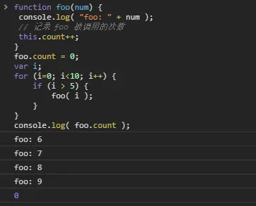 当执行 foo.count = 0 时,的确向函数对象 foo 添加了一个属性 count。但是函数内部代码this.count 中的 this并不是指向那个函数对象,所以虽然属性名相同,根对象却并不相同。这里的this.count实际上指的是在全局变量中的count,外部没有声明,其自动创建了一个。