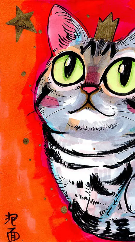 还是一碗泡面:风格就是自己内心的真实体现,越真诚的面对内心,越能找到自己的道路和风格。都说爱猫的人善良,爱猫的人懒散,爱猫的人富有艺术细胞,爱猫的人智商高。我想养了10多年猫,画了上万幅猫,早已被喵星人潜移默化。坚持做一件事情,内心会越做越明白。我就是画,我就是想画了。比如这只猫好看就画,想画什么就画什么,把这个东西积累起来,慢慢的就会使命感引导你,你会知道自己会成为一个什么样的人,会做什么样的事情,拥有什么样的风格。