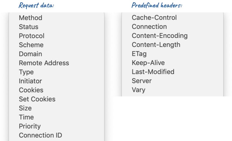 要自定义显示哪些列,只需右键单击请求表标题上的任意位置。请注意,Response Headers 是一个有更多选项的完整的子菜单,甚至可以定义你自己的选项。