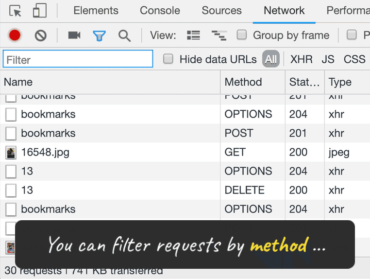 Network 面板中的过滤器输入可以接受你输入的字符串或正则表达式,仅显示匹配的请求。 但是你也可以使用它来过滤很多属性。