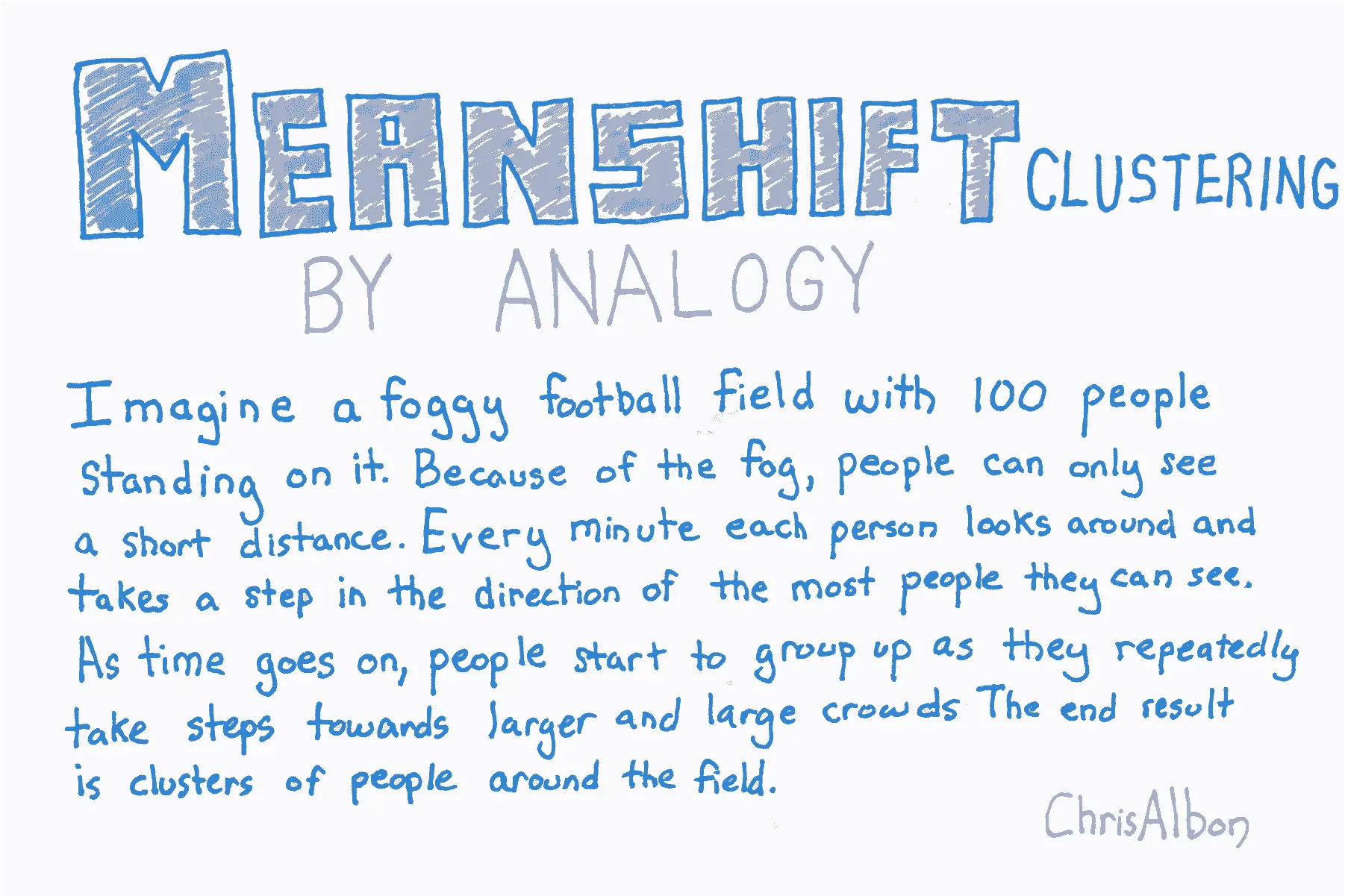 MeanShift有两个我们应该注意的重要参数。 首先,bandwidth设置区域(即观测核)半径,用于确定移动方向。 在我们的比喻中,带宽是一个人可以在雾中看到的距离。 我们可以手动设置此参数,但默认情况下会自动估算合理的带宽(计算成本会显着增加)。 其次,有时在均值移动中,观测核中没有其他观测结果。 也就是说,我们足球上的一个人看不到任何其它人。 默认情况下,MeanShift将所有这些“孤例”观测值分配给最近观测核。
