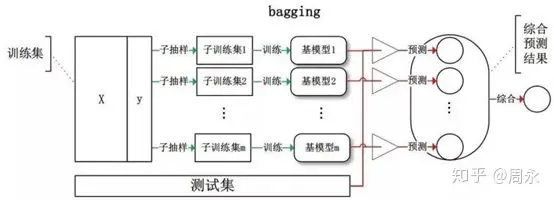 基于bagging 的集成学习,是通过不断的对训练样本集合做有放回的随机取样得到的。例如对训练集做M 次随机有放回抽样,那么我们可以得到M 个不同的训练集,对这M 个不同的训练集,我们构建一个模型去训练,这样就可以得到M 个不同的模型。最后再将这M 个模型的结果融合,得到最终的模型。其流程图如下: