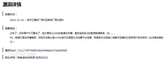 2014年12月25日上午,漏洞报告平台乌云网出现了一则关于12306的漏洞报告,危害等级显示为“高”,漏洞类型则是“用户资料大量泄漏”。