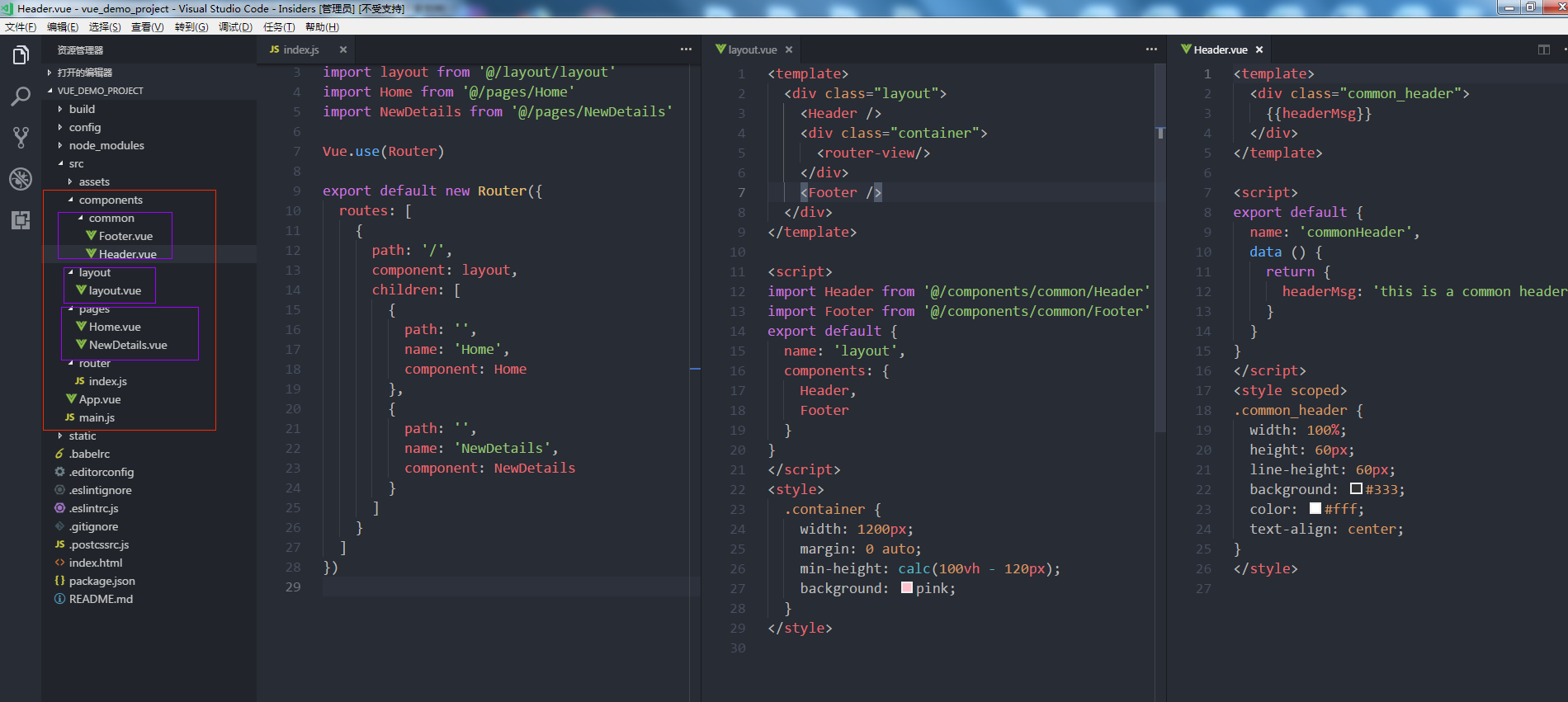 - 按下图所示新建pages,layout文件夹,新建vue文件(这里NewDetails组件的path应该为'/new_details')。