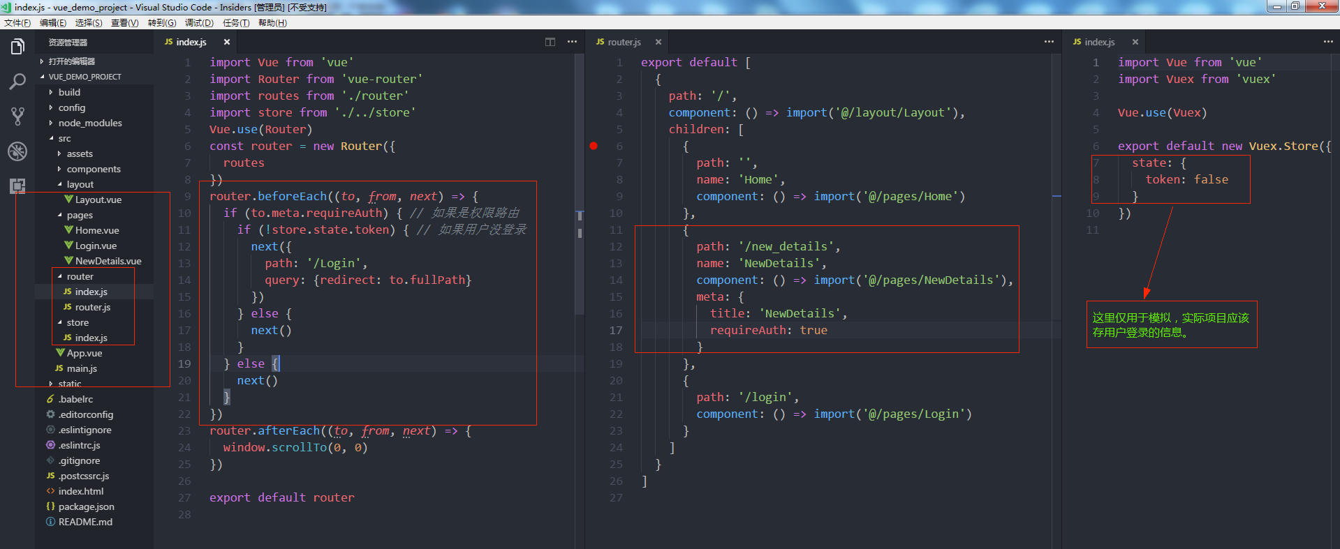 - 安装vuex(cnpm i vuex -S),修改router下的index.js文件如下图所示,采用按需加载: