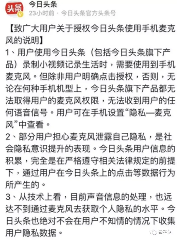 同时,今日头条表示,从技术上看,目前声音信息的处理,也远达不到通过麦克风获取个人隐私的水平。今日头条也绝不会在用户不知情的情况下收集用户隐私数据。