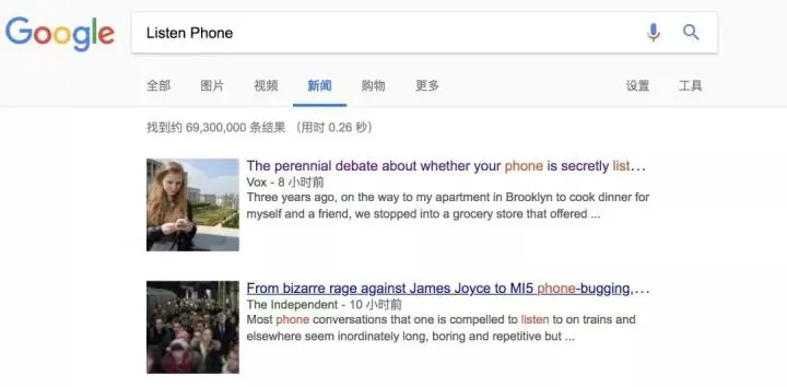用“Listen”(窃听)和“Phone”(手机)同时作为关键词在谷歌搜索,可以搜出6930万条相关报道。