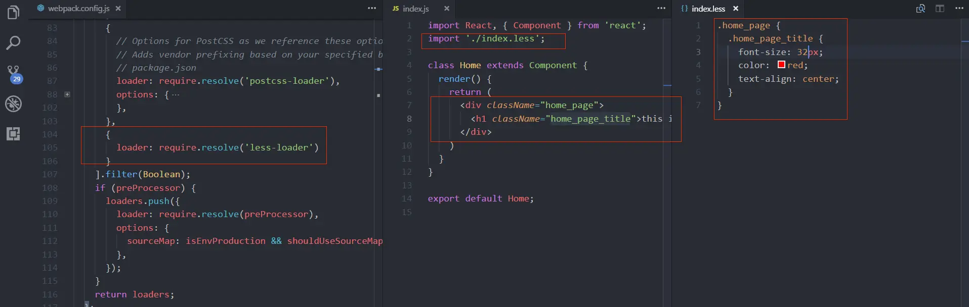 - less配置,查看webpack.config.js,发现只有scss(sass)的配置,如果你使用的sass,直接安装依赖即可,接下来的部分你可以跳过