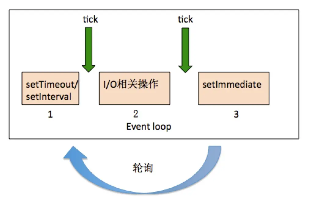 - Timer(setTimeout/setInterval) --tick-- I/O --tick-- Check(setImmediate)