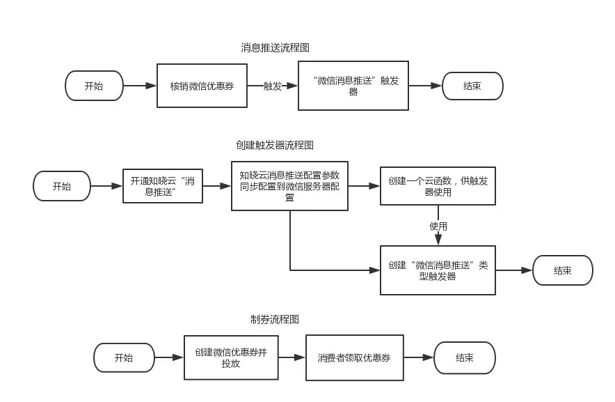 该触发器将会在消费者核销微信优惠券的时候触发,并调用一个云函数。调用的云函数会将核销的相关信息保存在一个特定的数据表中,由此来记录公众号卡券的使用情况。
