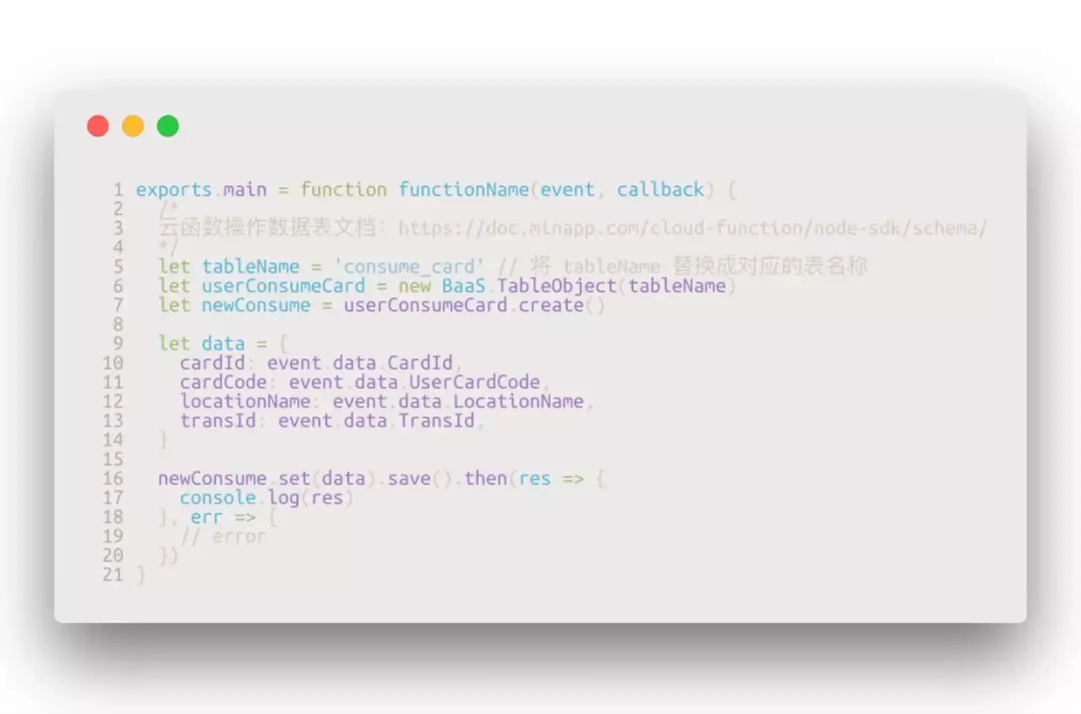 现在我们创建一个云函数,用于用户在核销卡券的事件触发时调用该云函数操作数据表,将微信推送过来的核销的相关数据保存到相关到表中。