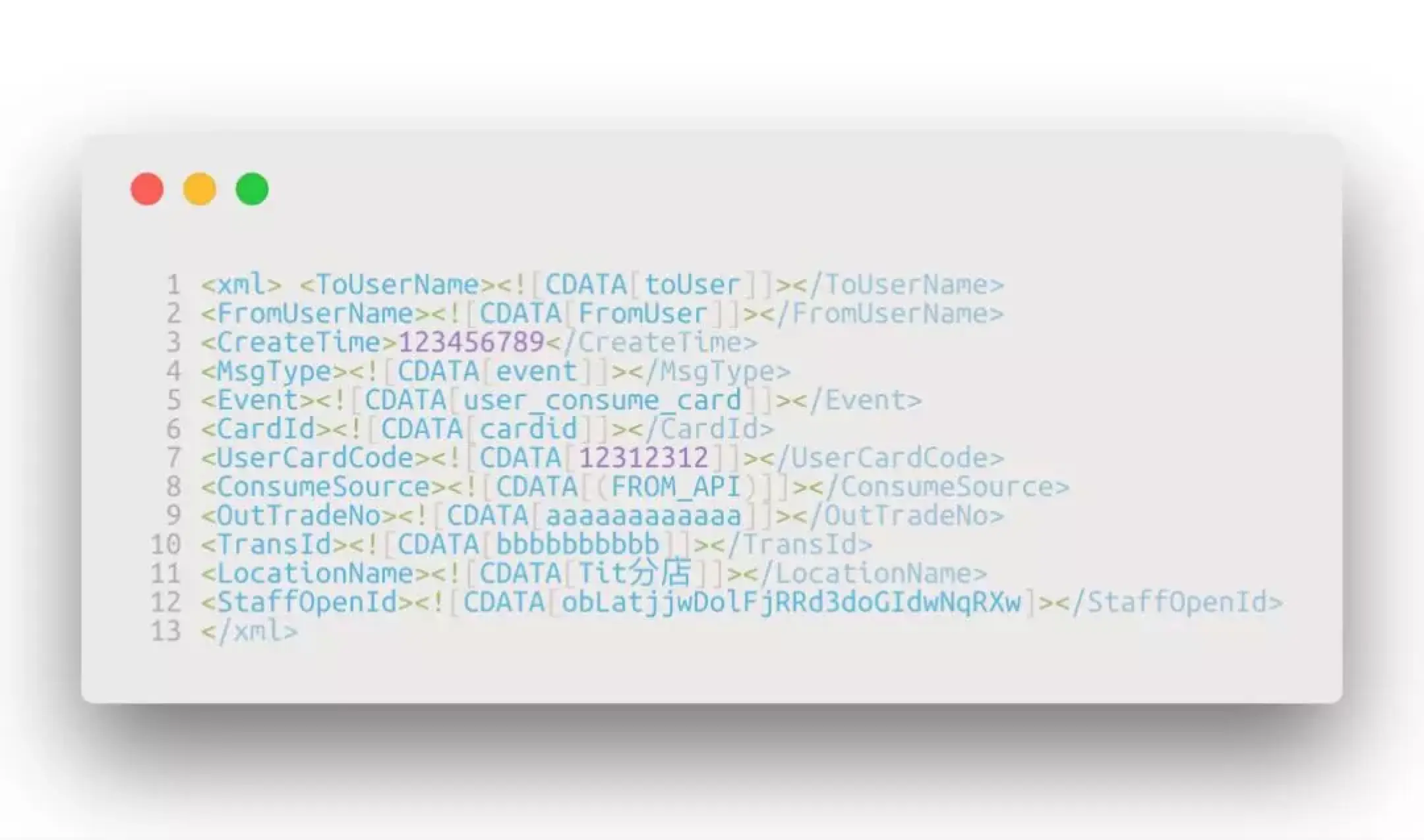 微信消息推送触发器返回的数据可在云函数的第一个参数 event.data 获取到,具体返回的数据有哪些可以查看微信开发者文档。例如卡券核销的返回数据如下,只是触发器将微信的 XML 格式的数据转换成了 JSON 格式。