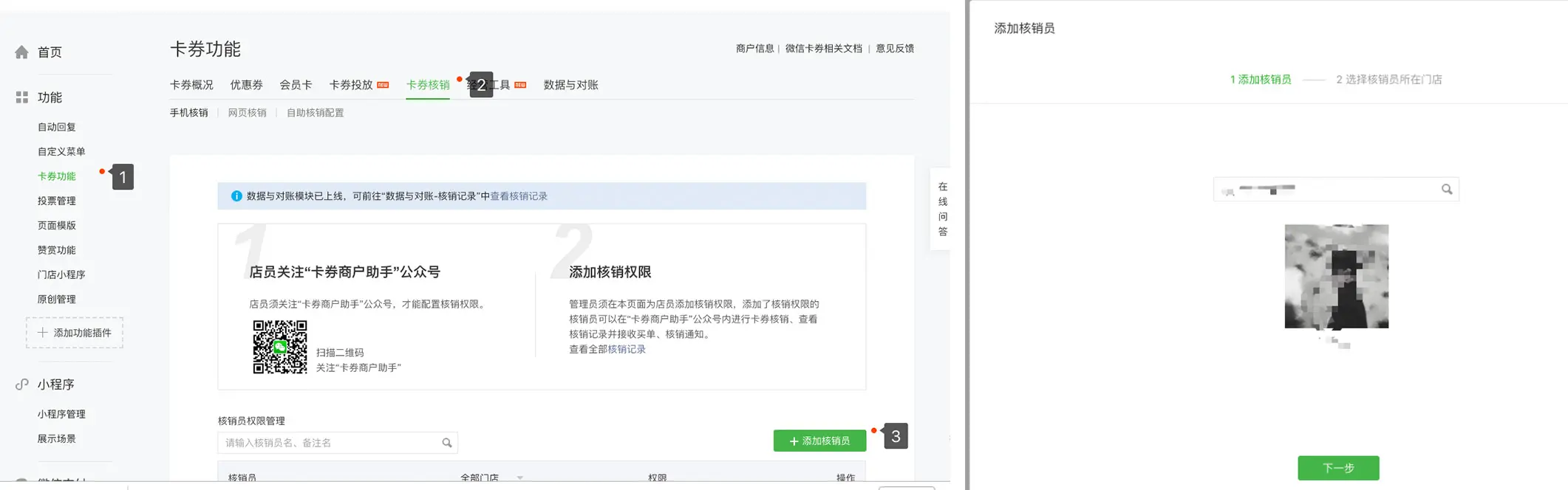 添加核销员之前,店员需要先关注「卡券商户助手」公众号,才能配置核销权限:
