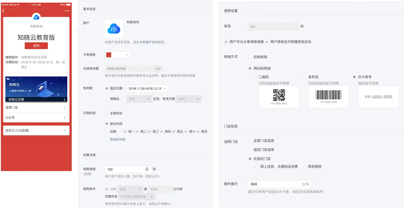 注意选择合适的「核销方式」,这关联到后面的核销可以采用那种方式进行核销。填写好相关信息点击下一步进入到「使用设置」,填写相关信息后提交审核。