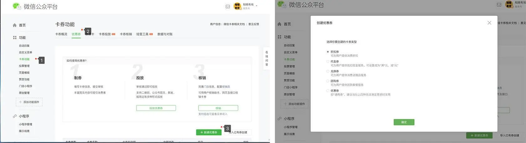 接下来我们来制作微信卡券,制券成功并核销后,将触发我们上面创建的触发器。 1.制券 微信公众平台 -> 卡券功能 -> 优惠券,点击「新建优惠券」,并选择卡券类型