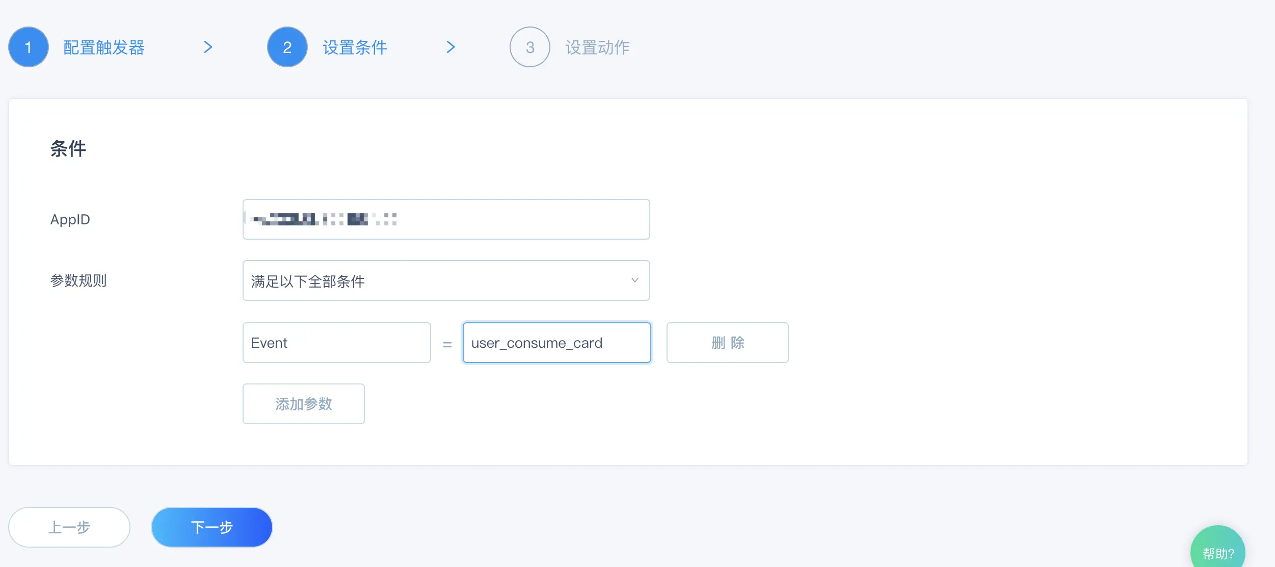 此教程为卡券核销事件推送,因此触发条件就为 evnet = user_consume_card 的事件: