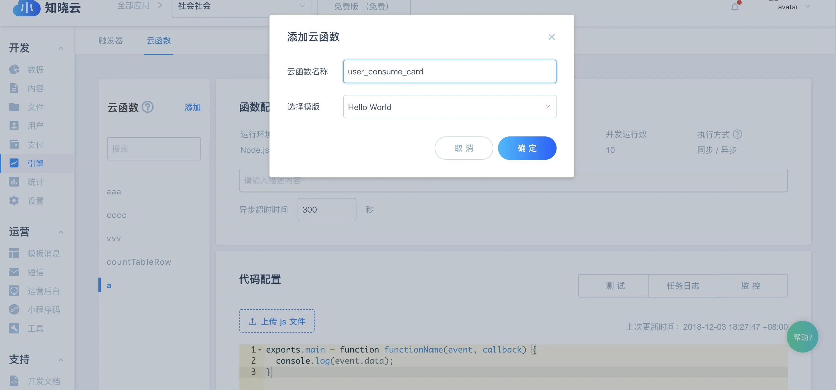 后面我们会创建一个动作类型为「云函数」的触发器,所以我们需要先创建一个云函数,供触发器使用。