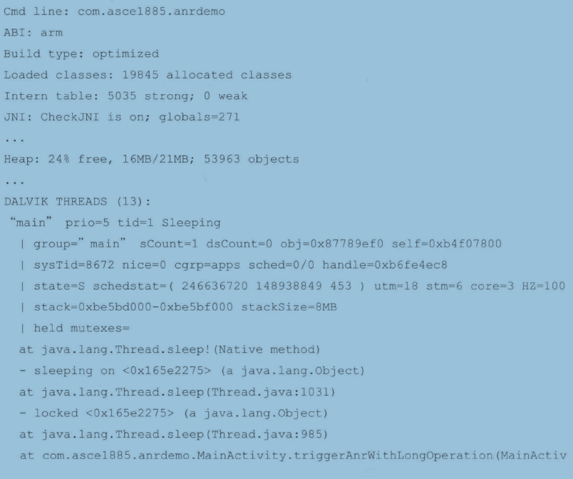 堆栈信息:从中可以看到,ANR是由于在MainActivity类中的triggerAnrWithLongOperation函数调用了Threadsleep导致