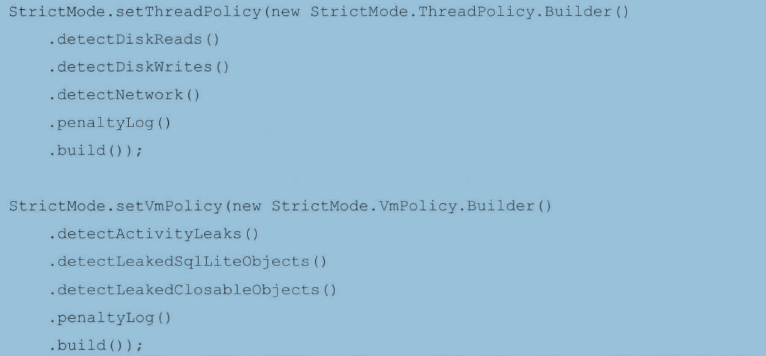 上面的初始化代码调用penaltyLog表示在Logcat中打印日志,调用detectAll方法表示启动所有的检测策略,我们也可以根据应用的具体需求只开启某些策略