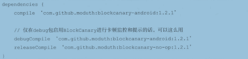 BlockCanary是一个非侵入式的性能监控函数库,它的用法和LeakCanary类似,只不过后者监控应用的内存泄漏,而BlockCanary主要用来监控应用主线程的卡顿,它的原理是利用主线程的消息队列处理机制,通过对比消息分发开始和结束的时间点来判断是否超过设定的时间,如果是,则判断为主线程卡顿,它的集成很简单,首先在build.gradle中添加在线依赖