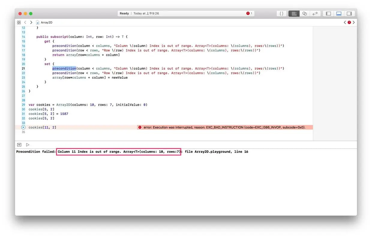 precondition(_:_:file:line:)函数类似assert,满足条件会造成程序的提前终止并抛出错误信息,详细查看官方文档。此处有来表示当下标超过范围的提示,效果如下: