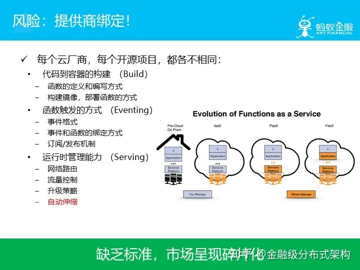 这就是目前 Serverless 的问题:由于缺乏标准,市场呈现碎片化。不同厂商,不同项目,各不相同,因此无论怎么选择,都面临一个风险:供应商绑定!
