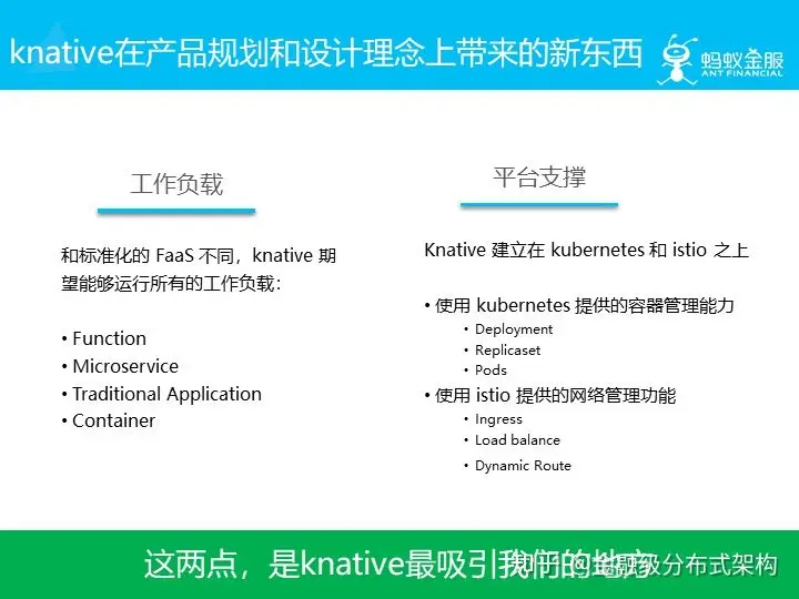 Knative 在产品规划和设计理念上也带来了新的东西,和传统 Serverless 不同。工作负载和平台支撑是 Knative 最吸引我们的地方。