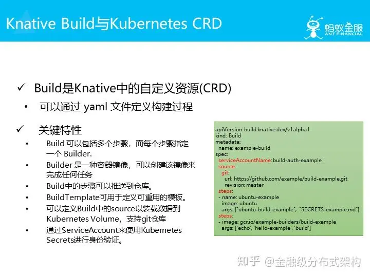 Knative Build 在实现时,是表现为 Kubernetes 的 CRD,通过 yaml 文件来定义构建过程。这里引入了很多概念如:Build,Builder,Step,Template,Source等。另外支持用 Service Account 做身份验证。