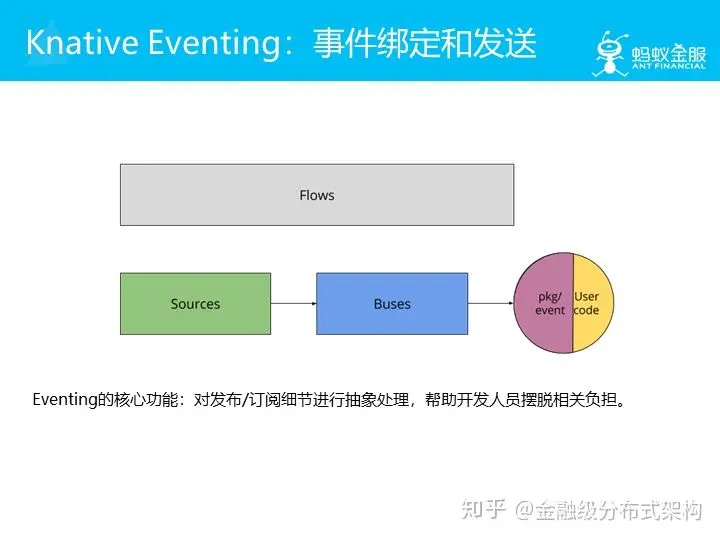 Knative Eventing 组件负责事件绑定和发送,同样提供多个抽象概念:Flow,Source,Bus,以帮助开发人员摆脱概念太多的负担(关于这一点,我保留意见)。