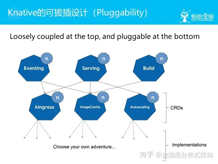 最后聊聊 Knative 的可拔插设计,这是 Knative 在架构设计上的一个基本原则:顶层松耦合,底层可拔插。