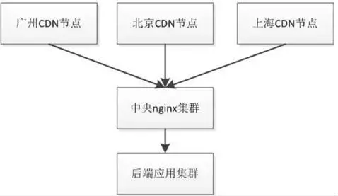 即用户首先访问到全国各地的CDN节点(使用如ATS、Squid实现),如果CDN没命中,会回源到中央nginx集群,该集群如果没有命中缓存(该集群的缓存不是必须的,要根据实际命中情况等决定),最后回源到后端应用集群。
